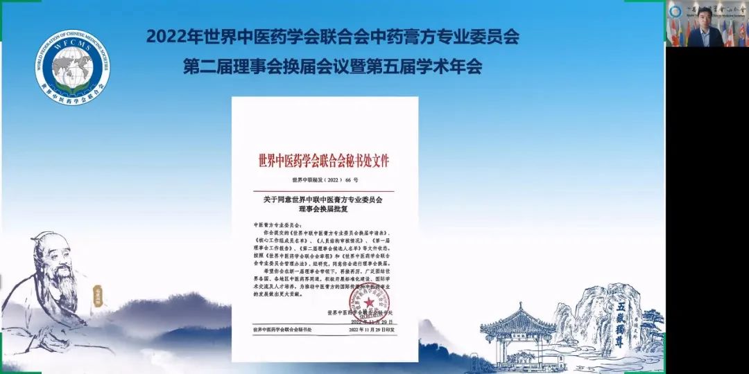 2022年12月4日上午,世界中醫(yī)藥學(xué)會(huì)聯(lián)合會(huì)(世界中聯(lián))中醫(yī)膏方專(zhuān)業(yè)委員會(huì)第二屆理事會(huì)換屆會(huì)議暨第五屆學(xué)術(shù)年會(huì)通過(guò)線(xiàn)上方式隆重召開(kāi)。世界中聯(lián)主席馬建中向大會(huì)發(fā)來(lái)視頻致辭,學(xué)術(shù)部主任焦云洞代表世界中聯(lián)參加大會(huì),全國(guó)政協(xié)委員、首都名中醫(yī)、享受?chē)?guó)務(wù)院政府特殊津貼專(zhuān)家、世界中聯(lián)中醫(yī)膏方專(zhuān)業(yè)委員會(huì)會(huì)長(zhǎng)、北京康益德中西醫(yī)結(jié)合肺科醫(yī)院董事長(zhǎng)兼院長(zhǎng)董瑞和顧問(wèn)、副會(huì)長(zhǎng)、常務(wù)理事、理事及會(huì)員共335人參加了大會(huì)。其中來(lái)自匈牙利、葡萄牙、澳大利亞、俄羅斯、瑞典、波蘭、英國(guó)、美國(guó)、芬蘭、韓國(guó)、中國(guó)香港、中國(guó)澳門(mén)、中國(guó)臺(tái)灣等地的外籍專(zhuān)家學(xué)者65人。會(huì)議由第一屆理事會(huì)秘書(shū)長(zhǎng)秦洪義教授主持。