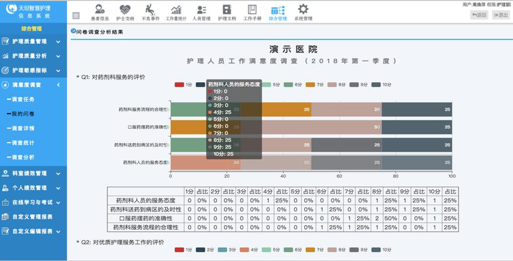 天坦按照國際JCI標準和HIMSS 7級標準,將護理管理關(guān)注點進行梳理、歸納、整合,將住院病房、護士工作站、護理部、醫(yī)院信息系統(tǒng)4大場景互聯(lián)互通,實現(xiàn)數(shù)據(jù)傳輸及時性、準確性,利用對各項數(shù)據(jù)的挖掘,生成各種統(tǒng)計報表,為管理者提供科學分析決策,形成一套安全、有效、完整、流暢的管理系統(tǒng)。