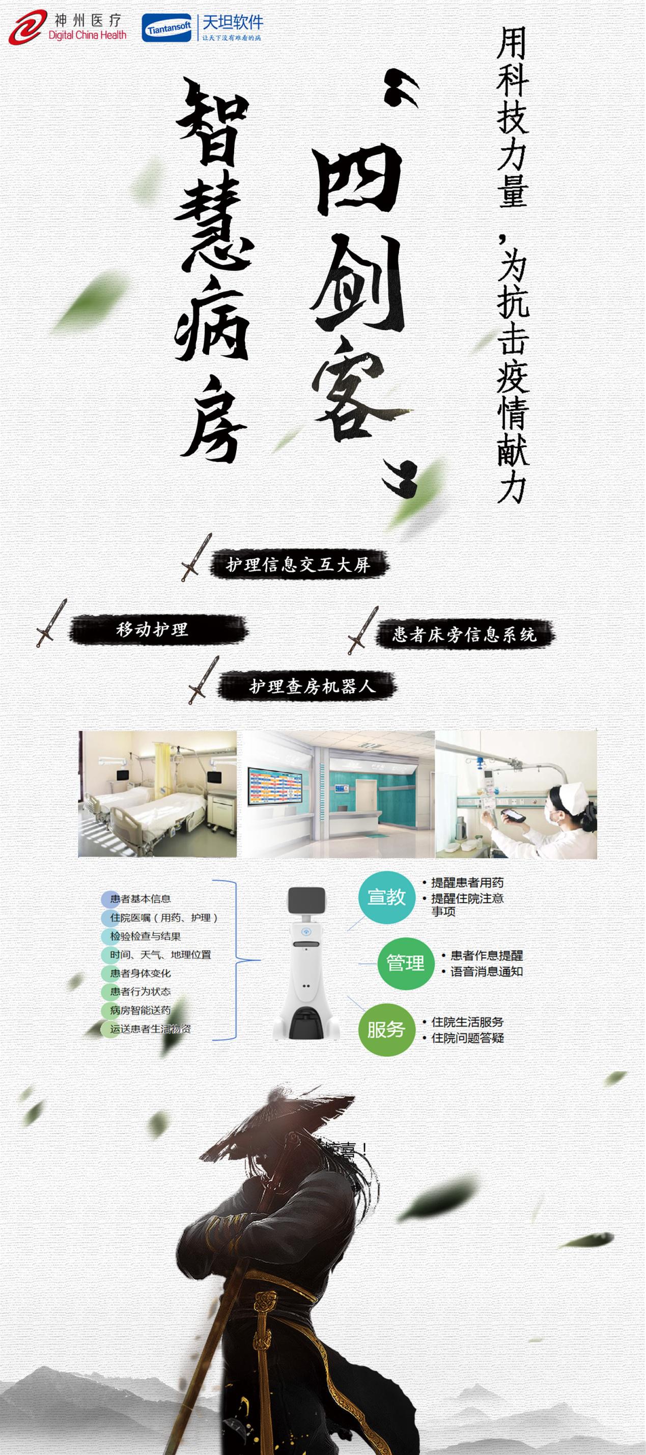 神州天坦智慧病房"四劍客",是神舟天坦憑借著十余年在醫(yī)療衛(wèi)生領(lǐng)域中豐富的行業(yè)經(jīng)驗(yàn)積累,并針對(duì)此次新冠疫情防治的一線醫(yī)護(hù)人員日常工作需求,優(yōu)選出的可以快速搭建、臨床實(shí)用性高的智慧病房四大子系統(tǒng),具有很強(qiáng)的建設(shè)價(jià)值。以軟硬件、物聯(lián)網(wǎng)和人工智能技術(shù),構(gòu)筑起防治新型冠狀病毒的信息化關(guān)口,為醫(yī)護(hù)人員診療工作、患者住院服務(wù)進(jìn)行保駕護(hù)航。以科技的力量為抗擊疫情獻(xiàn)力,我們一起攜手同行、共克時(shí)艱。贏得這場(chǎng)沒(méi)有硝煙的戰(zhàn)“疫”,中國(guó)加油!戰(zhàn)“疫”必勝!