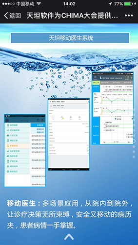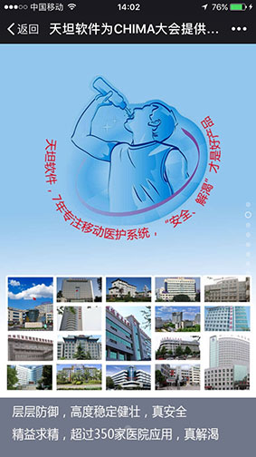 通過這樣一年一度高規(guī)格的國(guó)家級(jí)盛會(huì),加強(qiáng)了移動(dòng)醫(yī)療行業(yè)的交流與合作,推動(dòng)了移動(dòng)醫(yī)療產(chǎn)業(yè)健康可持續(xù)發(fā)展。同時(shí)激勵(lì)著天坦軟件要為移動(dòng)醫(yī)療做出更大的貢獻(xiàn),正如與會(huì)專家對(duì)天坦軟件的評(píng)價(jià)一樣 “渴了就喝天坦特供水,“天然、健康、安全、解渴”的產(chǎn)品,才是好產(chǎn)品”。